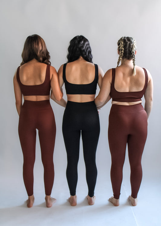 "I could not love this set more! The color is super flattering on my fair skin & the material is thick and supportive. Allows me to move through a yoga class easily but also provides necessary support! I do recommend you size up as the material isn’t super stretchy. I got a size small!